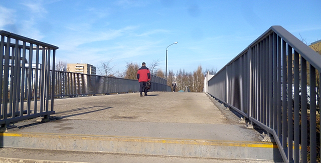 Die aus dem Jahr 1984 stammende Spannbeton-Fertigteilbrücke mit anschließenden Rampen wies im Bereich der Treppen und Rampenstützen weitgehende Schädigungen aufgrund Frost-Taumittel-Beanspruchung auf, Geländer und Berührungsschutz mussten erneuert werden. Es wurde ein vollständiges Instandsetzungskonzept nach vorangegangener Erfassung des Ist-Zustandes der Bauteile aufgestellt und die Ausführungsplanung erarbeitet.