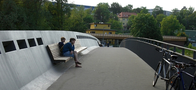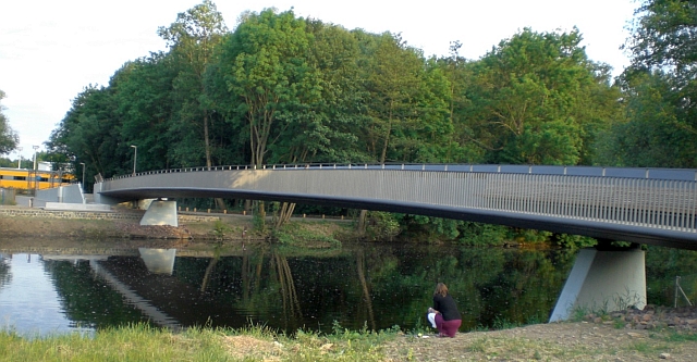 Dreifeldtragwerk mit dichtgeschweißtem Stahlhohlkasten über die Saale in Jena. Der schlanke Überbau erforderte die Anordnung eines Schwingungstilgers. Die einzelnen Schüsse des Überbaus wurden am Ufer verschweißt und anschließend mit Hilfe eines Pontons und Sarens Modulfahrzeugen in die endgültige Lage eingeschoben .